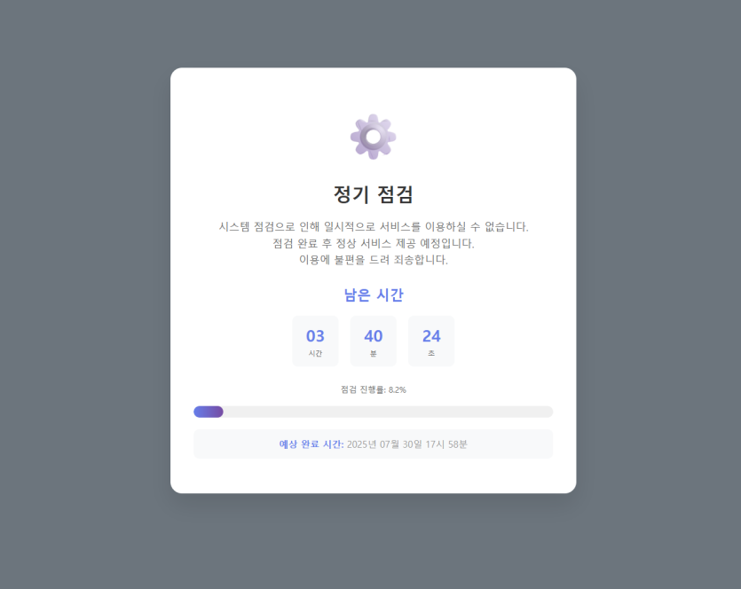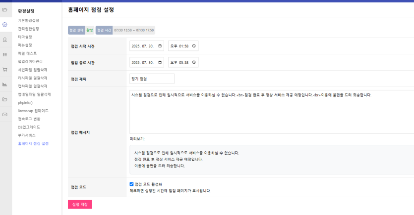 설정 시 해당 시간 동안은 홈페이지 점검 페이지가 강제로 노출 되며,